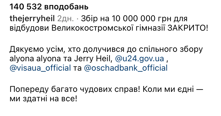 25 травня співачки Alyona Alyona та Jerry Heil закрили збір коштів на відбудову Великокостромської гімназії, що на Криворіжжі. Збір тривав місяць – від 25 квітня.