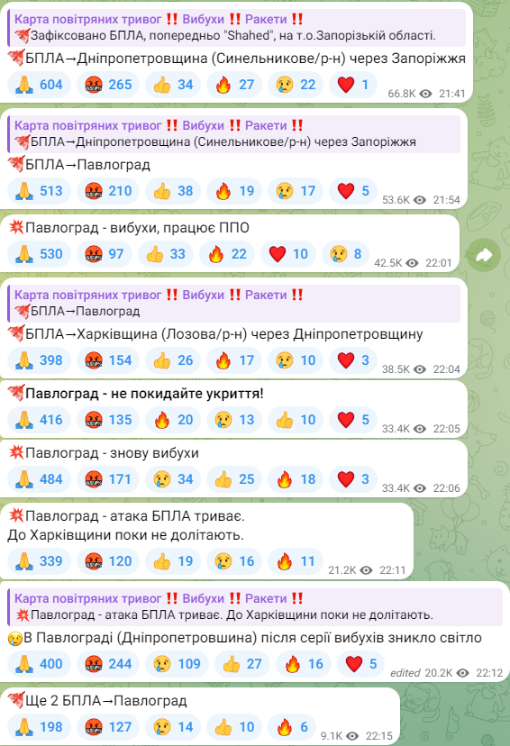 Станом на 21:22 на Дніпропетровщині оголошено повітряну тривогу – у наш бік знову летіли шахеди. Про небезпеку попереджають Павлоград. Попередньо повідомлялось, що там чули вибухи.