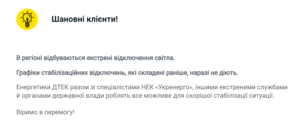 Проте, у ДТЕК додали, що вони докладають всіх зусиль, щоб почергово давати світло по 3-4 години, де це можливо, якщо не буде додаткових обмежень від НЕК Укренерго.