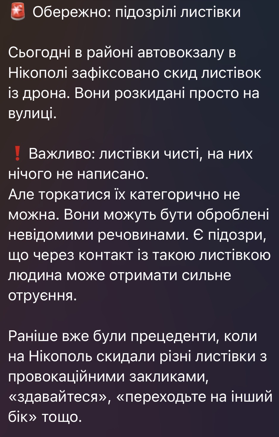 У соцмережах ширилась інформація, що у Нікополі з безпілотника розкидали начебто отруйні листівки.