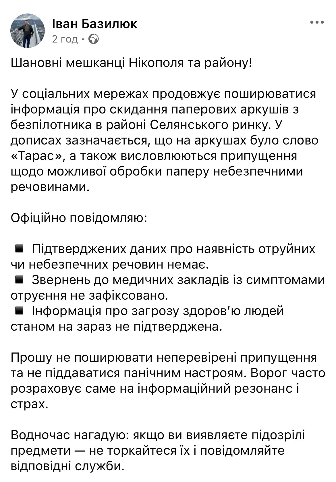 Закликав не поширювати неперевірені припущення, не піддаватися панічним настроям, але і нагадав про обережне поводження з підозрілими предметами і необхідність повідомляти про них відповідні служби.