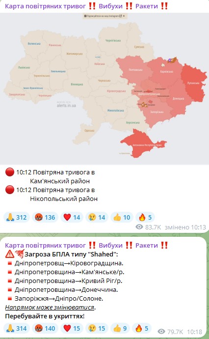 Під час повітряної тривоги на Дніпропетровщині пролунало кілька гучних вибухів. Про небезпеку попереджали Дніпровський. Самарівський, Павлоградський, Криворізький, Кам’янський райони.