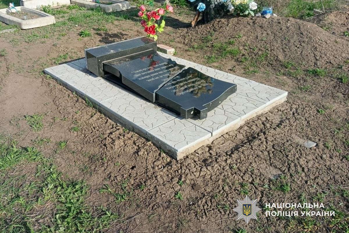 На місце прибули поліцейські офіцери громади та слідчо-оперативна група. Під час огляду місцевості правоохоронці виявили та задокументували численні пошкодження пам’ятних плит та хрестів. В ході слідчих заходів поліцейські встановили, що до злочину причетна 32-річна жителька Камʼянського. Жінку затримали.