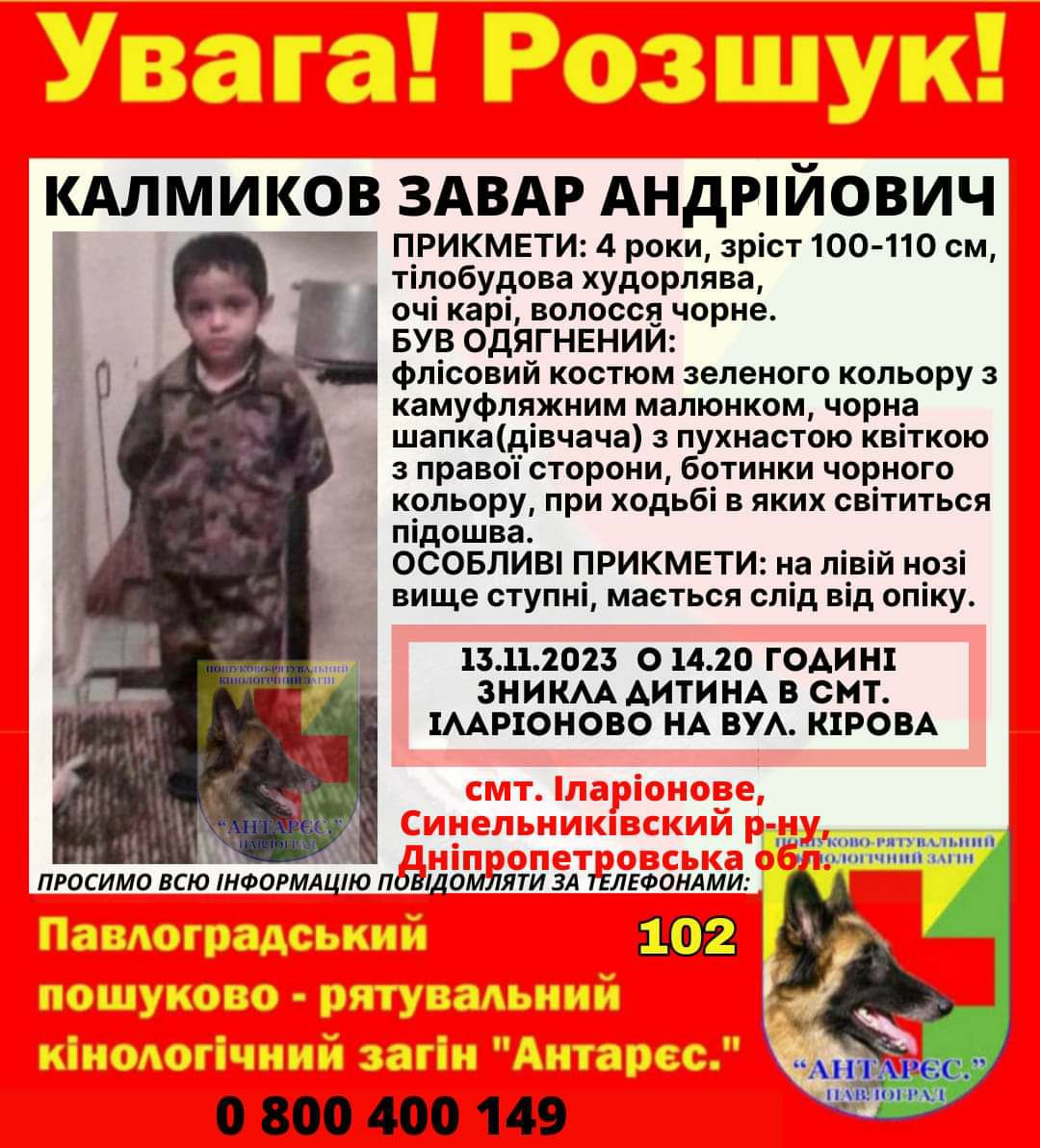 13 листопада після 14 години в смт Іларіонове Синельниківського району зник 4-річний хлопчик – Завар Калмиков.
