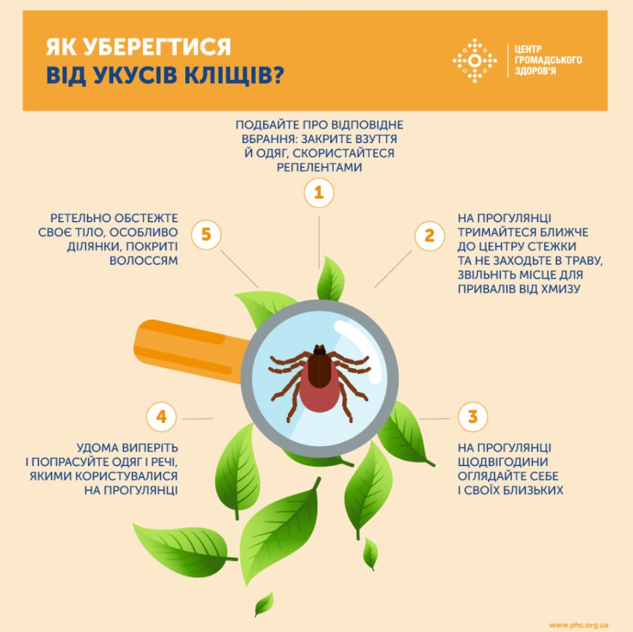 - слід використовувати репеленти (засоби, що відлякують кліщів), які краще купувати в аптечній мережі, наносити репеленти відповідно до інструкції.