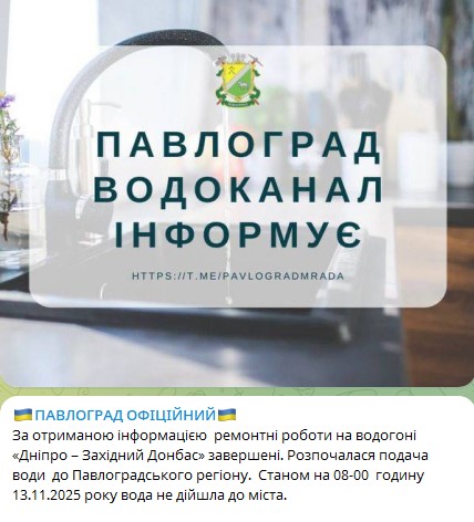 Ранком 13 листопада на офіційному телеграм-каналі Павлограду повідомили, що за отриманою інформацією ремонтні роботи на водогоні «Дніпро – Західний Донбас» завершені і розпочато подачу води до Павлоградського регіону. Проте, станом на 8:00 годину 13 листопада вода до міста іще не дійшла. Тож, у зв’язку з відсутністю централізованого водопостачання в ті райони міста, де немає колонок, буде організовано підвіз питної води протягом дня.