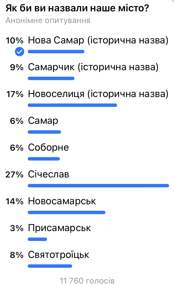 З понад 11 тисяч людей, що проголосували, найбільше – 27% – обрали назву Січеслав. За ним – Новоселиця і Новосамарськ.