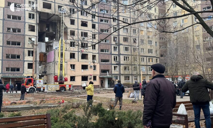 У Дніпрі в будинку на Перемозі, який постраждав 8 листопада від ворожої атаки, ранком 9 листопада мешканців пустили до пошкоджених підʼїздів взяти речі.