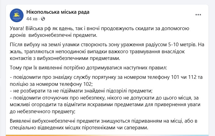 А на офіційній сторінці Нікопольської міської ради повідомляли, що війська рф вдень і вночі скидають за допомогою дронів вибухонебезпечні предмети на Нікополь. Нагадали, що вибуху на землі уламки створюють зону ураження радіусом 5-10 метрів. Через неуважність у місті траплялися непоодинокі випадки важкого травмування внаслідок контактів з вибухонебезпечними предметами.