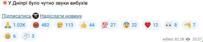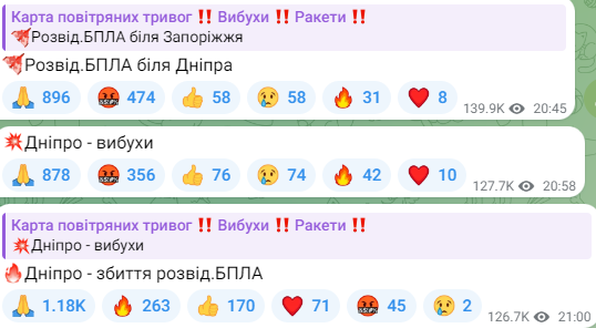 У Дніпрі близько 21-ї години на різних телеграмканалах почали ширитись повідомлення про вибухи.