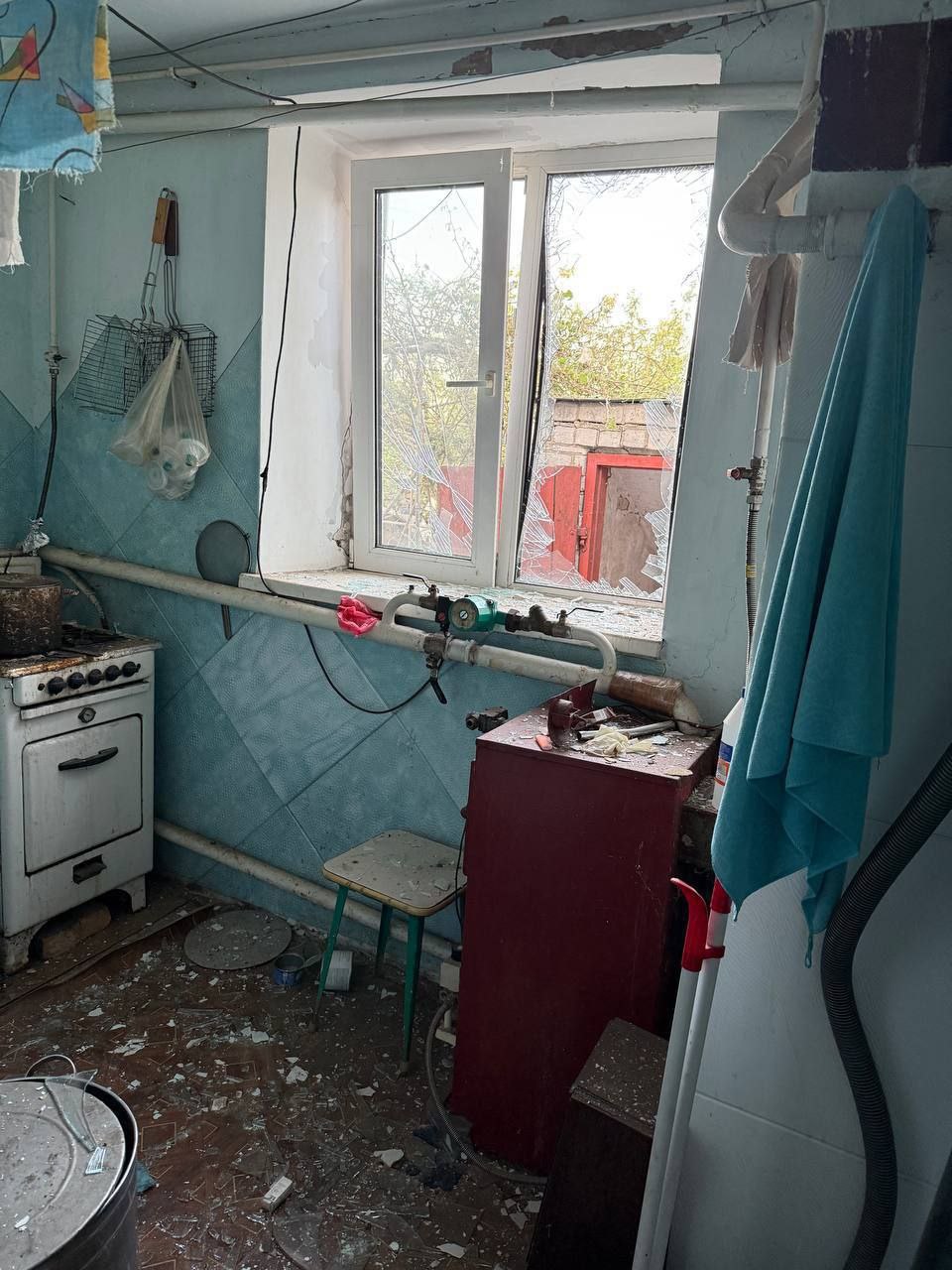 Пошкоджені промислове підприємство, 4 багатоповерхівки і 5 приватних будинків, господарські споруди, гараж. Побито легковик та лінію електропередач. Зайнялася суха трава. Загоряння приборкали.