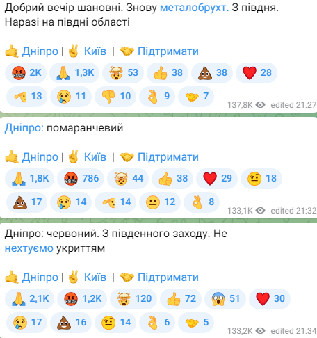 Станом на 21:27 моніторингові чати повідомляли про небезпеку: